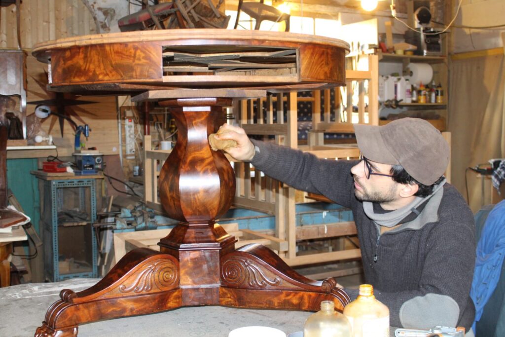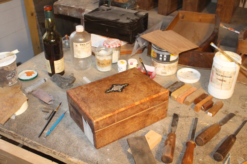Et une dimension esthétique : restituer les manques de placage, dissimuler certains accidents, changer un cuir, réparer un marbre, nettoyer et traiter les ornements en bronze, alléger un vernis dégradé, mettre en teinte, vernir, etc…